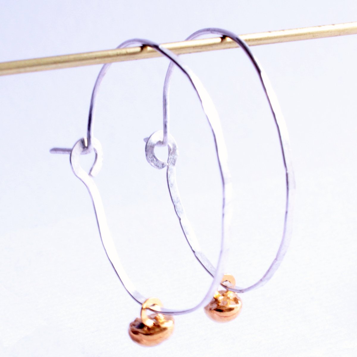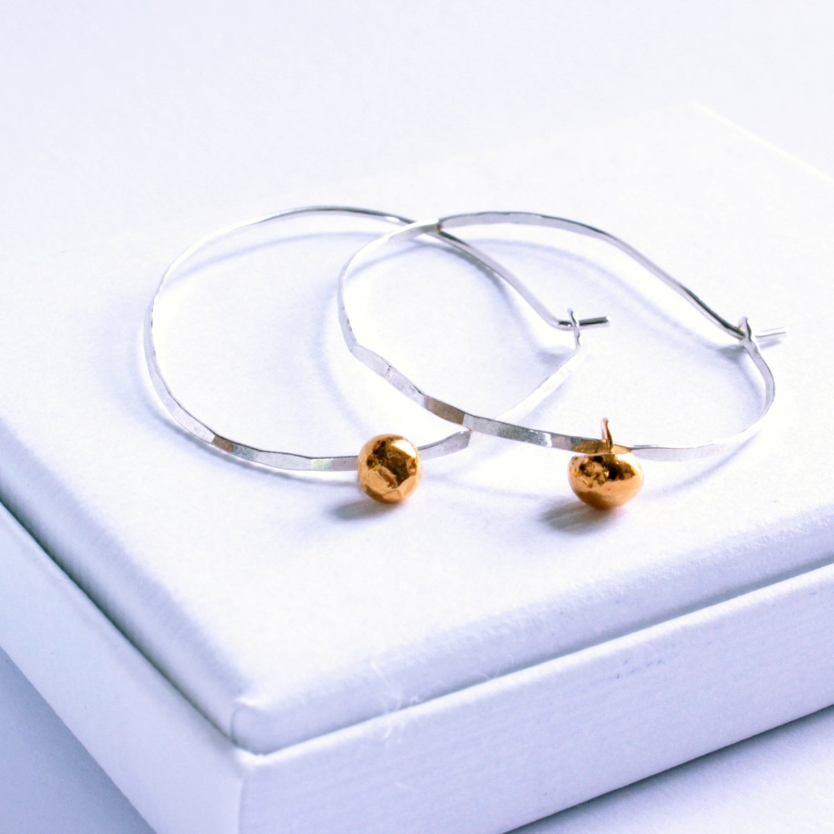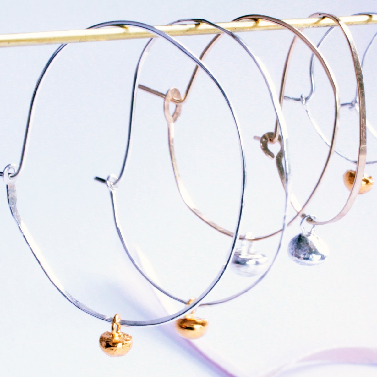 A delicate oval hoop earring with a contrasting charm. Both shapes echo the irregular, tactile nature of pebbles on a beach. Each piece is made by hand in my London studio.